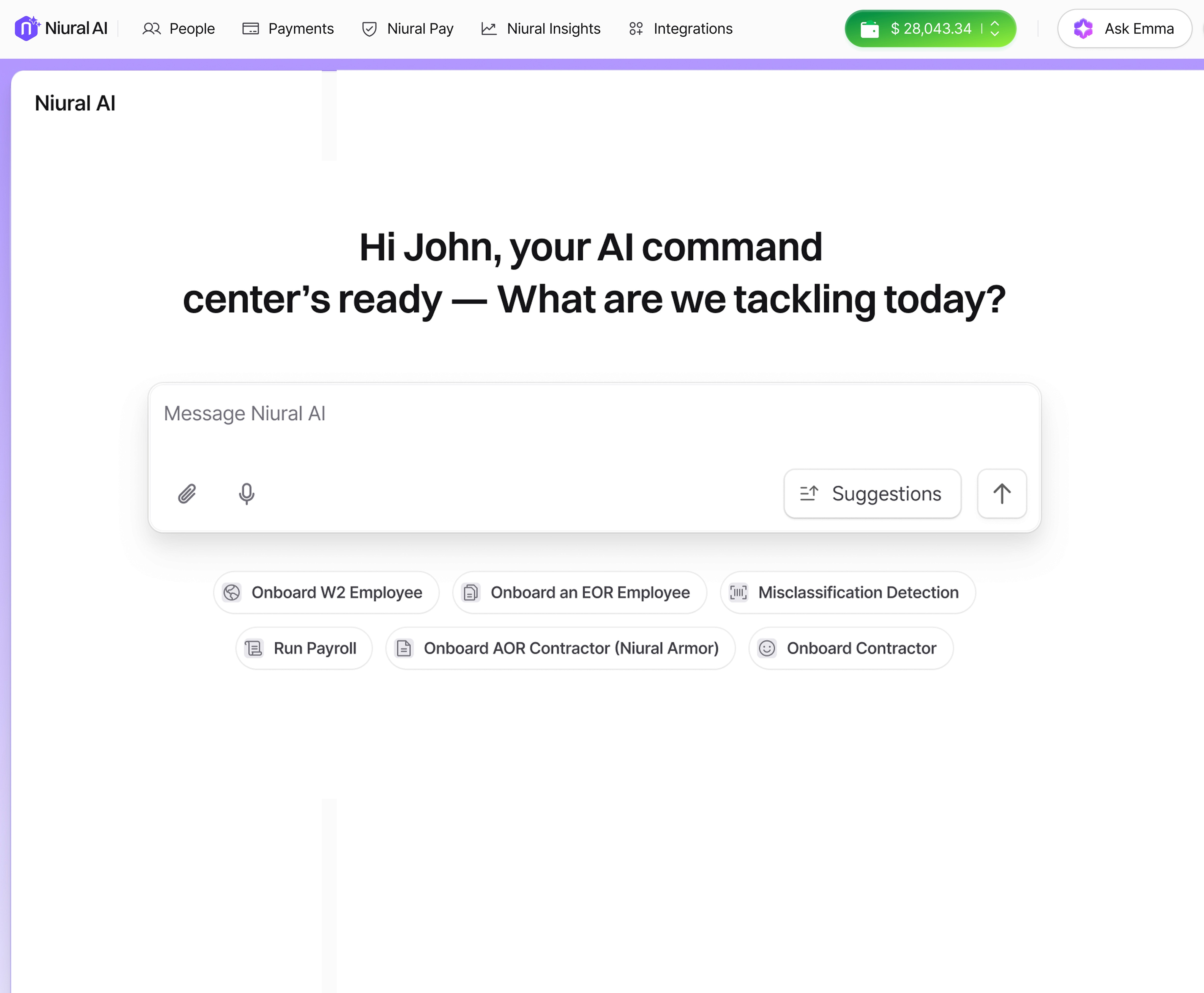 Niural AI acts as your co-employer, handling payroll processing, benefits administration, and HR compliance so you can focus on running your business. One platform, one login, one less thing on your plate.